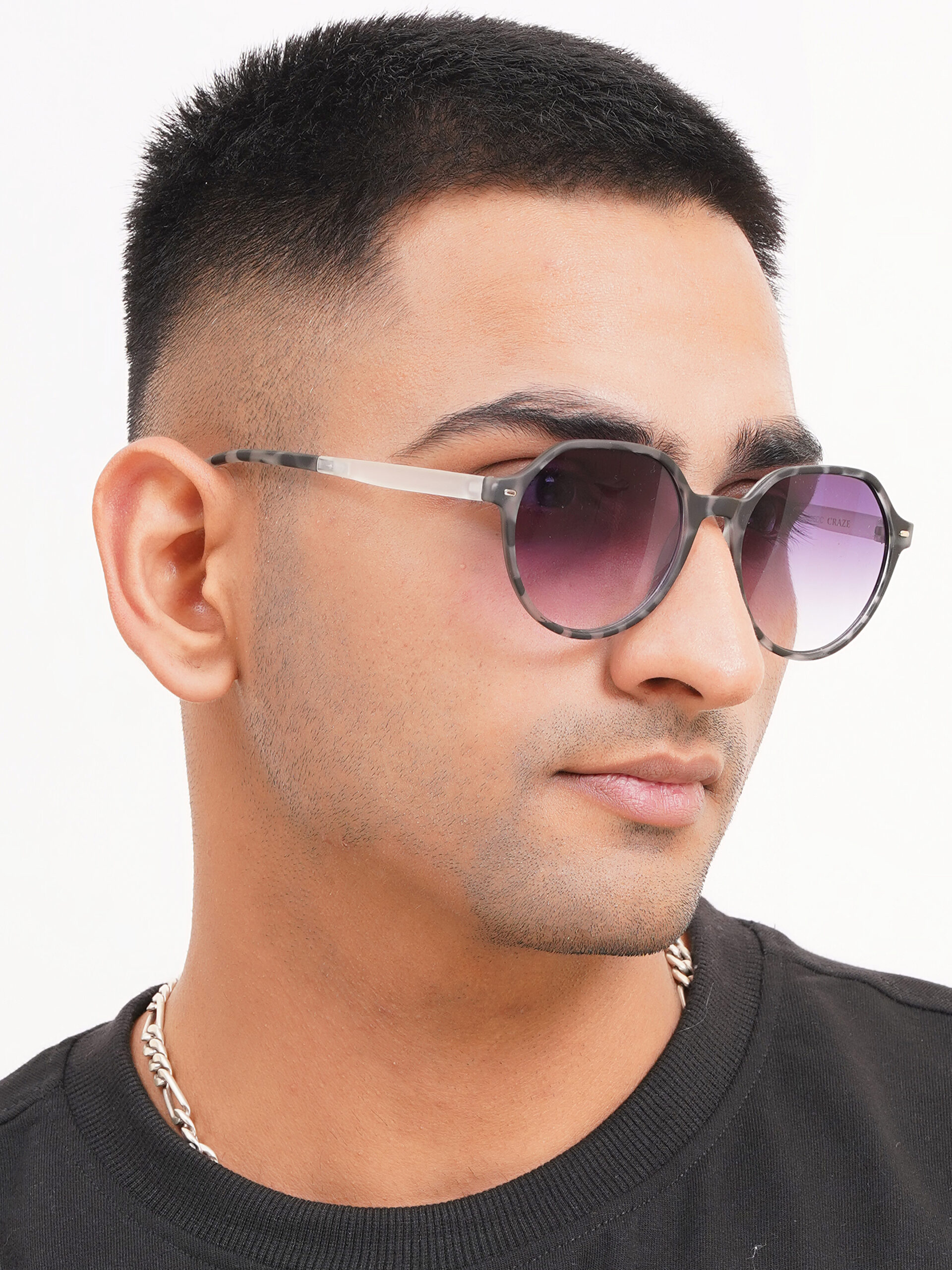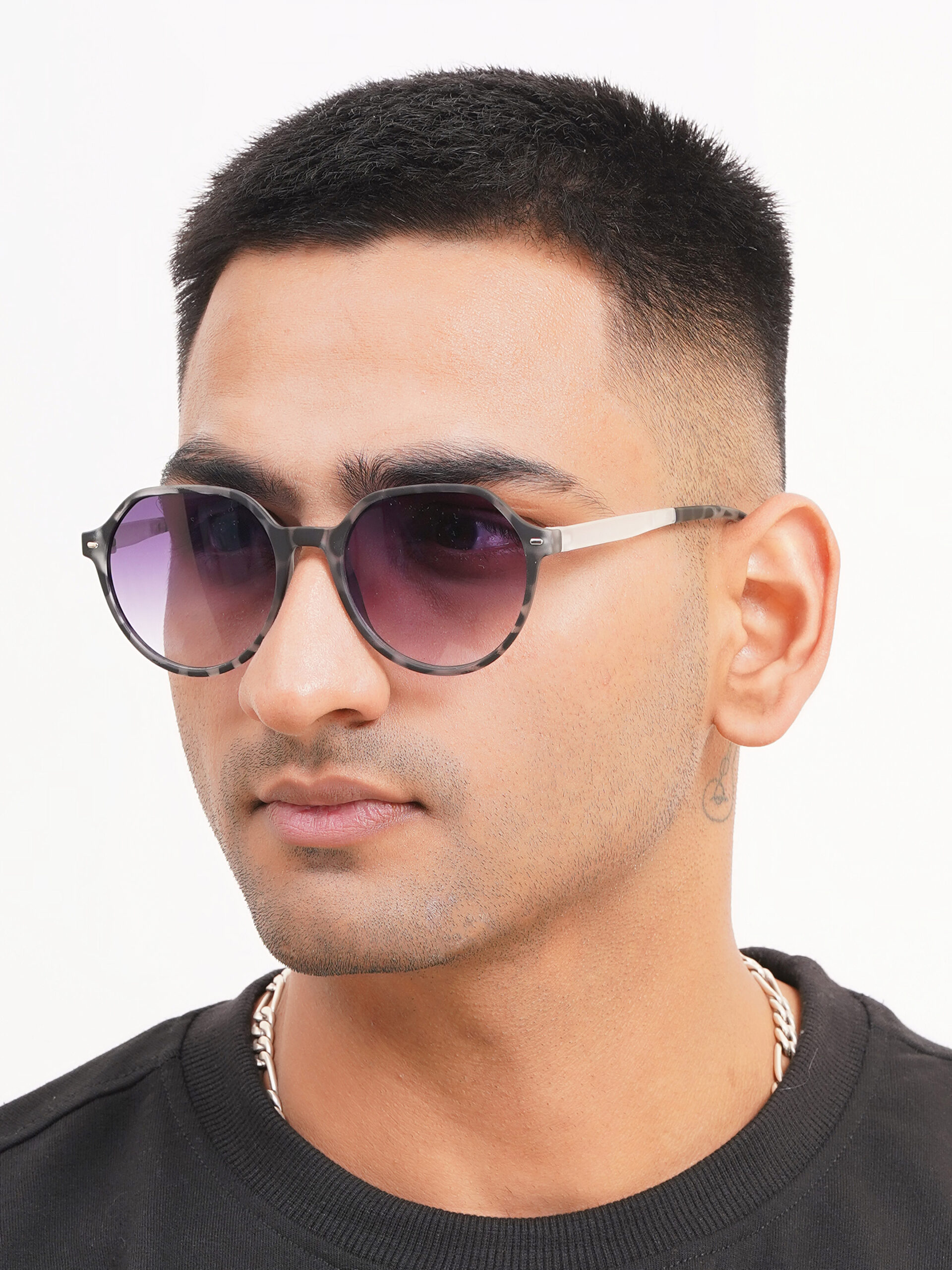 KAPCHA Men’s Round Sunglasses, UV Protected Lens, Purple Toned Frame, Trendy Design, Leather Case