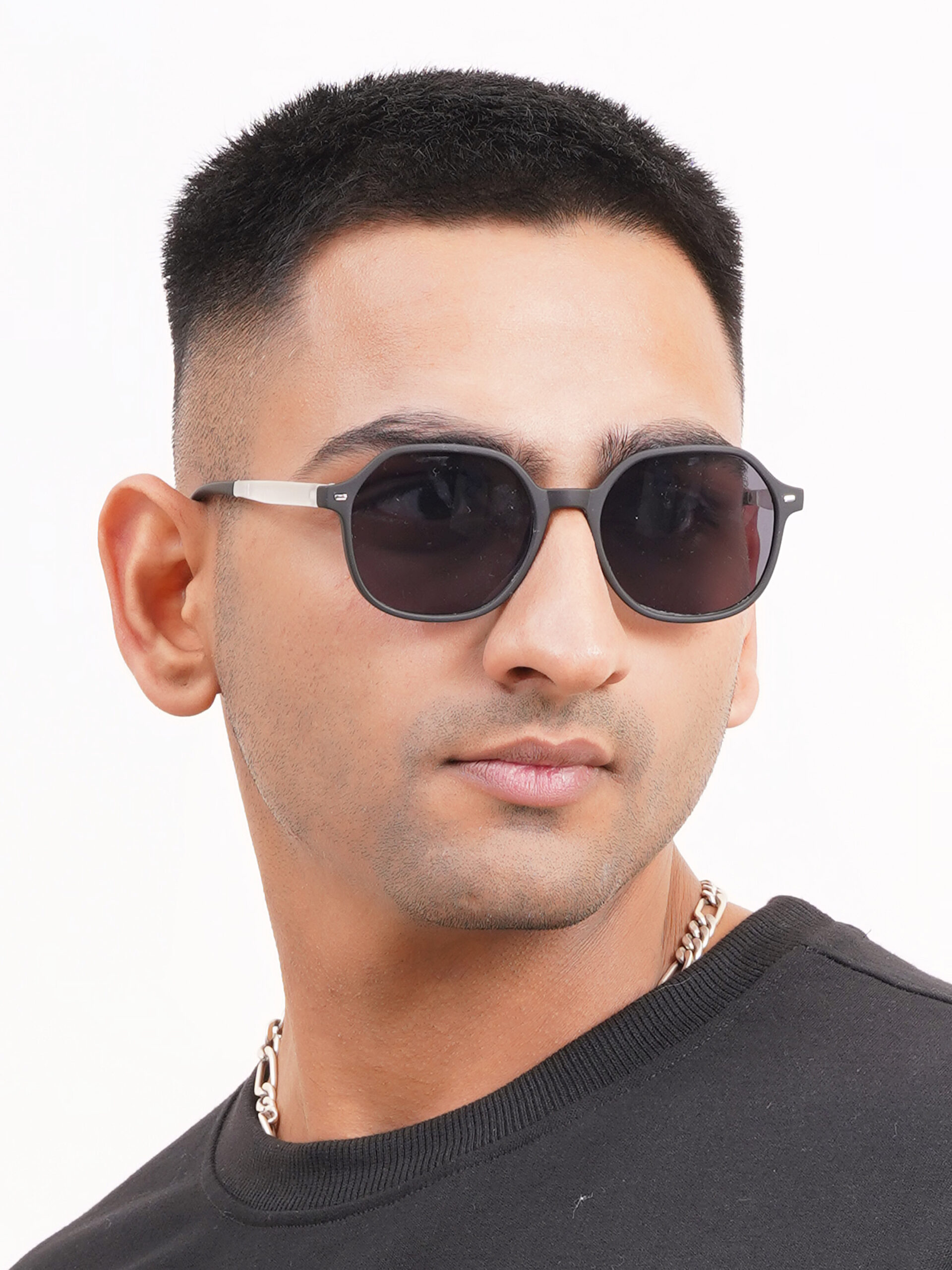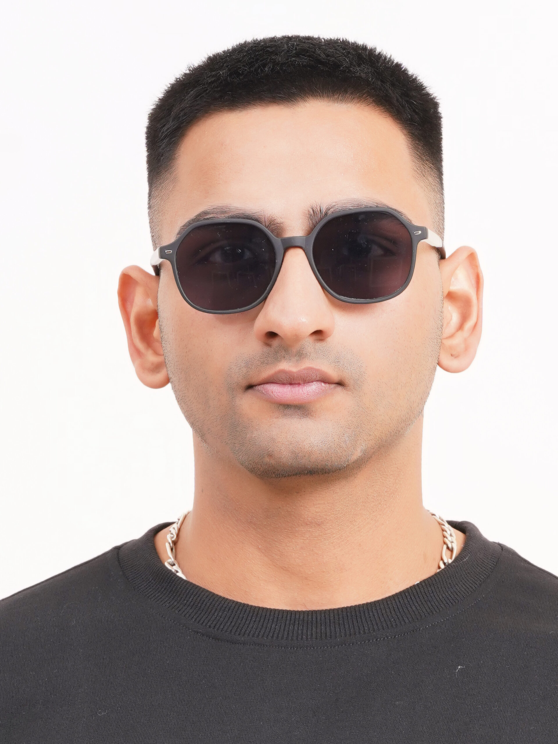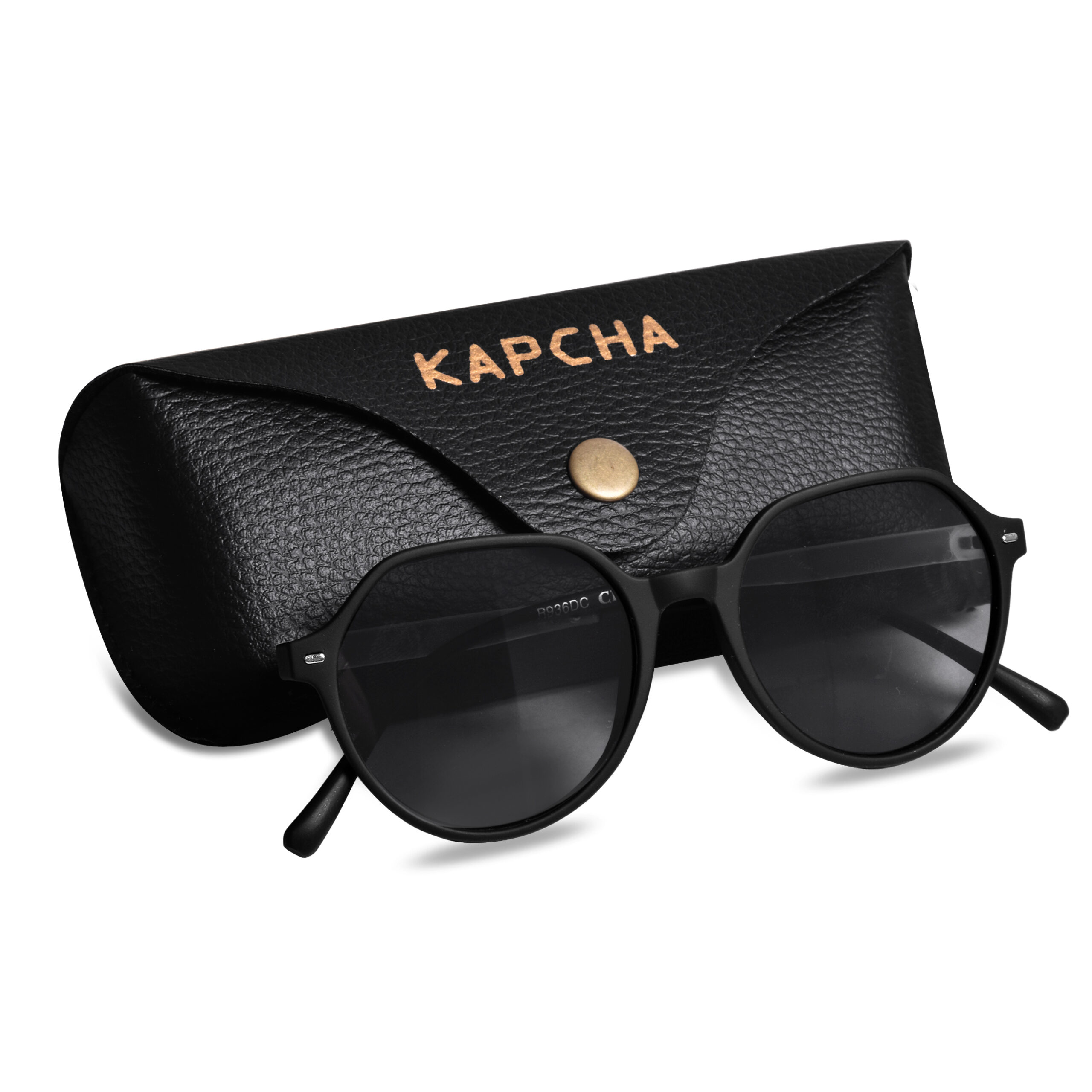 KAPCHA Round Sunglasses For Men, Black Frame with White Arms, UV Protected Lens, Leather Case