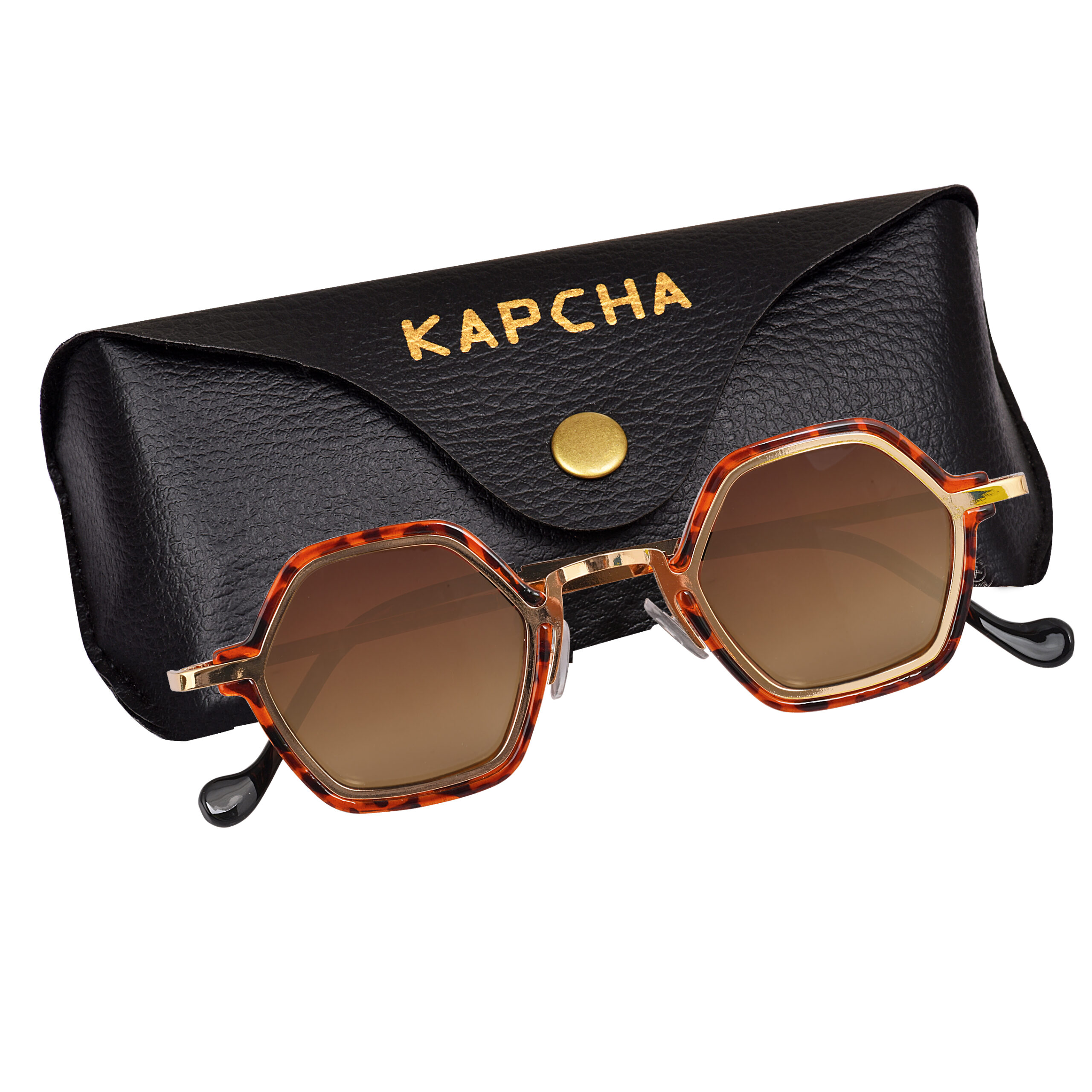 KAPCHA Hexagonal Sunglasses For Women, Vintage Charm Sunglasse, Tortoise Shell Frame with Gold Metal Arms, Gradient Brown Lenses, Leather Case