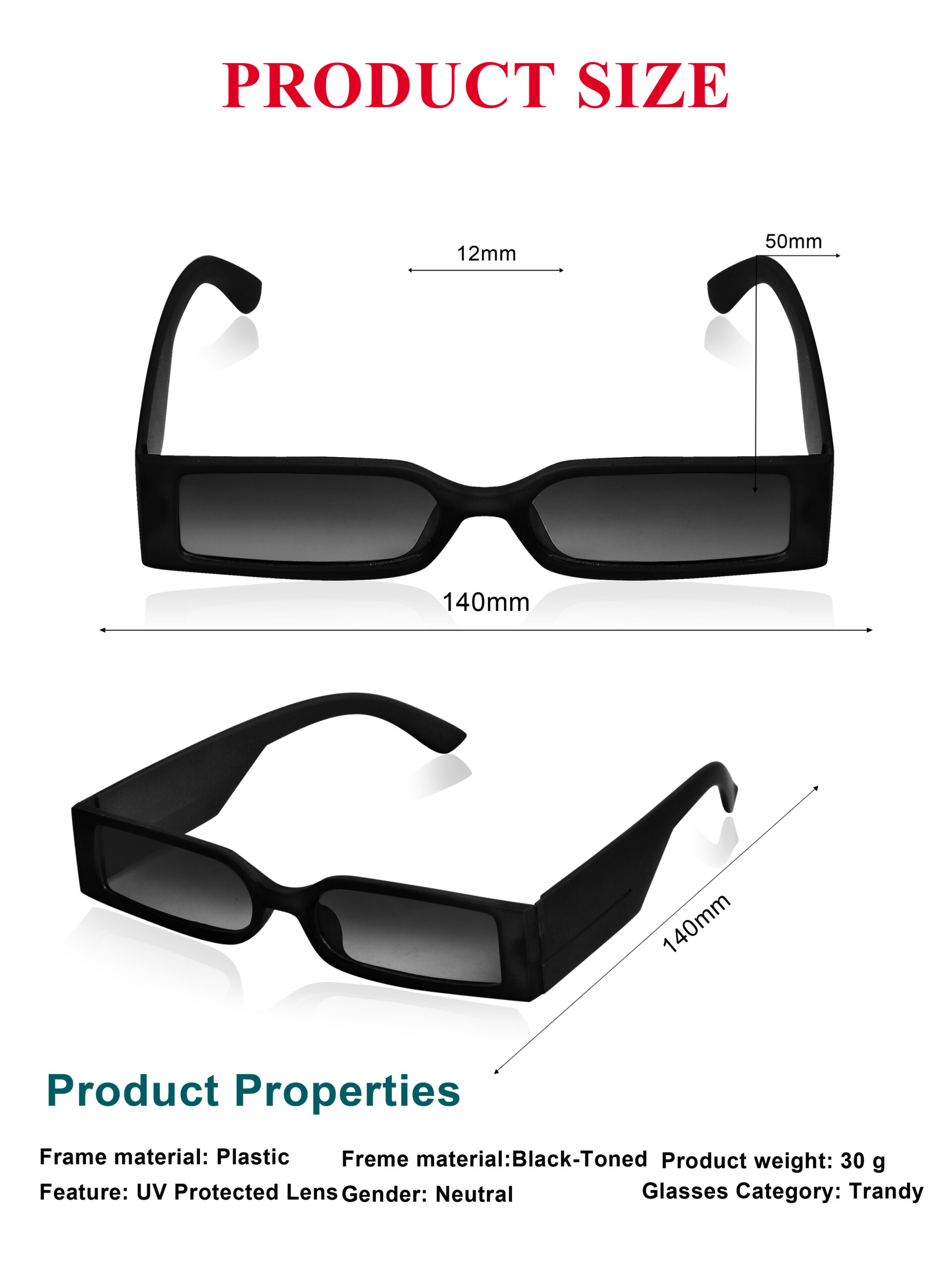 Make a bold fashion statement with these trendy rectangular sunglasses featuring a distinctive Black-toned frame design. The sleek plastic construction weighs just 30g, offering lightweight comfort for all-day wear. These gender-neutral sunglasses showcase UV-protected gradient lenses in an elegant rectangular shape, measuring 140mm in width with 12mm thick frames and 50mm temple length. The sophisticated Black gradient lenses complement the modern rectangular silhouette, perfect for elevating any casual or formal outfit. Each pair comes with a premium black leather KAPCHA case featuring a secure button closure to keep your sunglasses protected when not in use. The contemporary design combines style with practicality, making these sunglasses an essential accessory for fashion-forward individuals looking to add a touch of sophistication to their eyewear collection.
