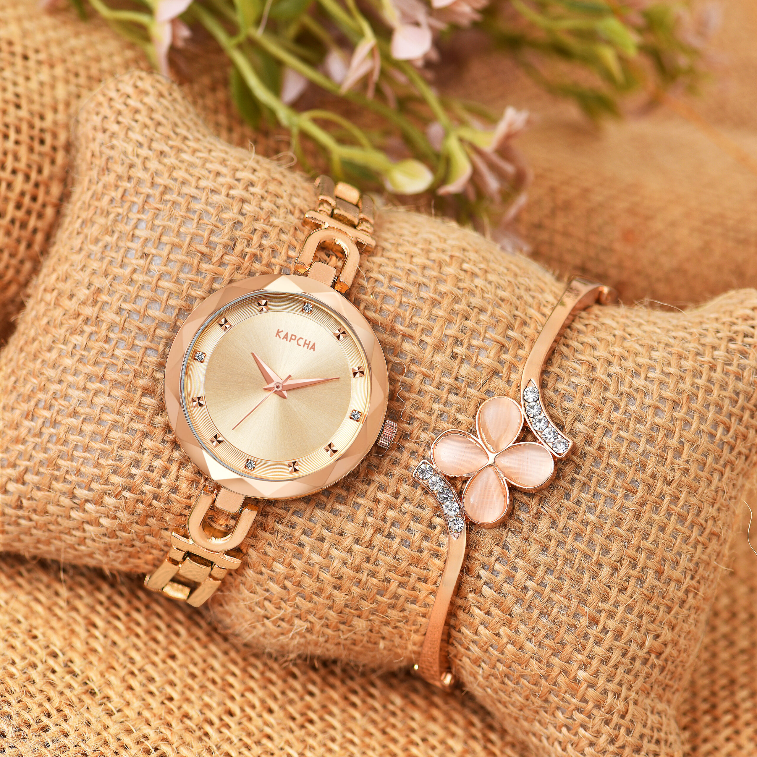 KAPCHA Versatile Stylish Women’s Mesh Strap Watch with Rose Gold Floral Gifting Bracelet Round Dial Shape, Quartz Movement.