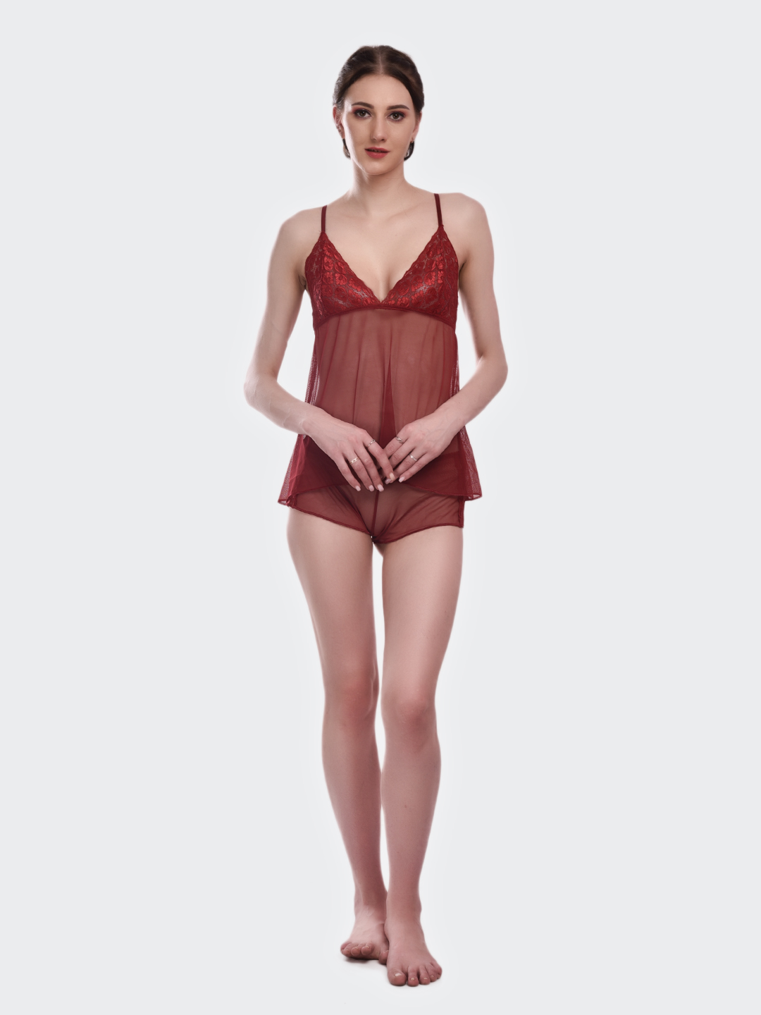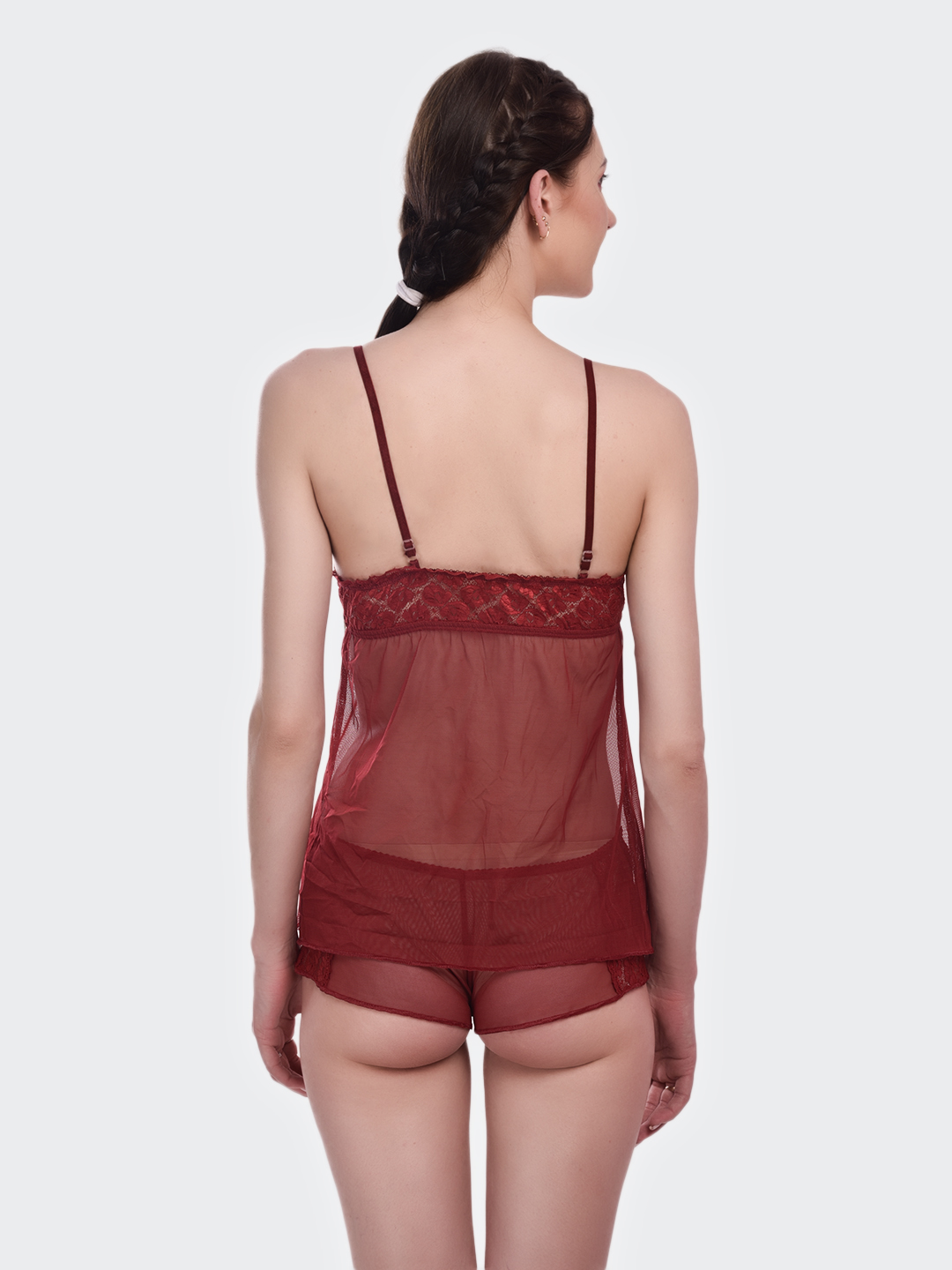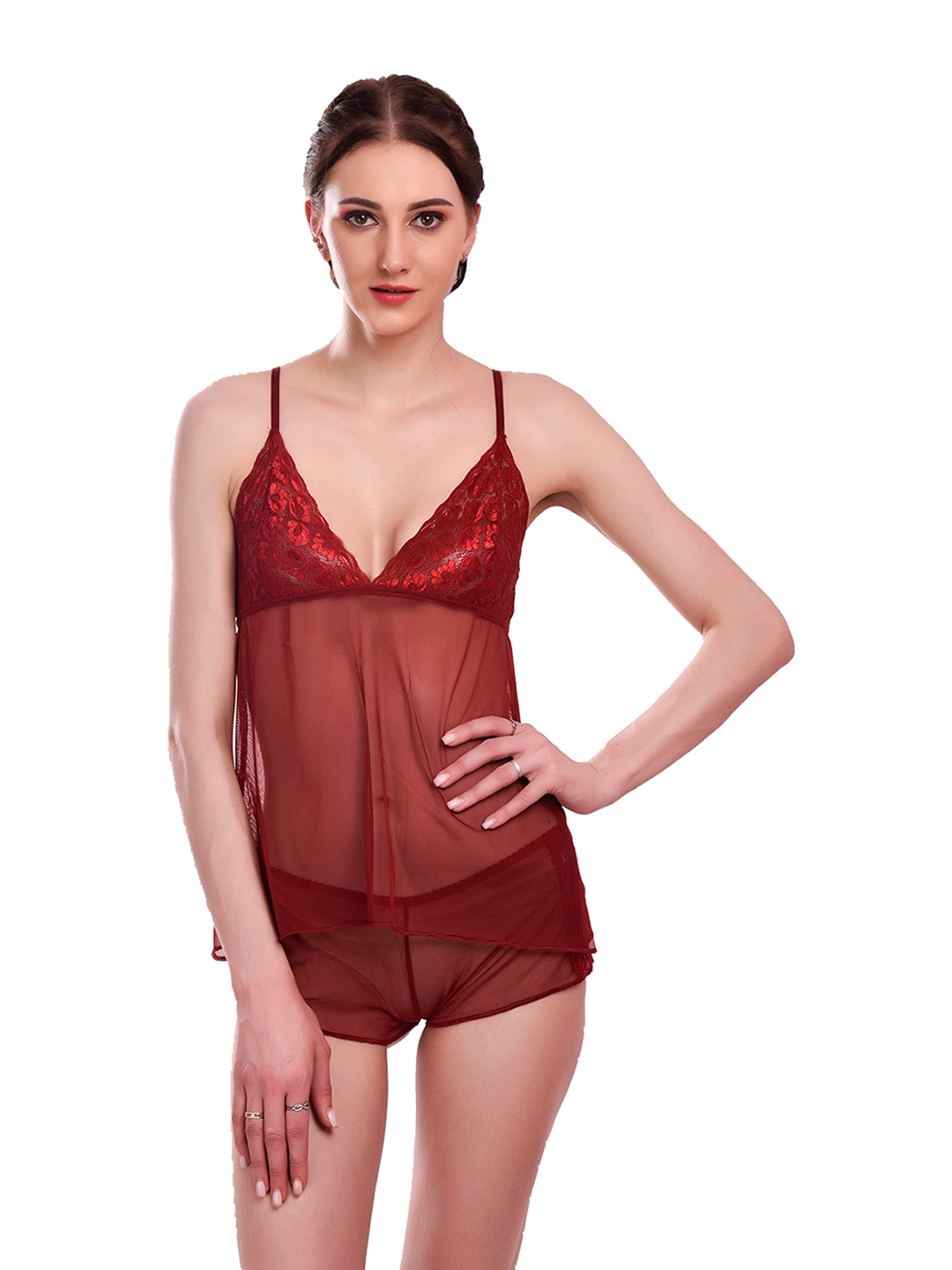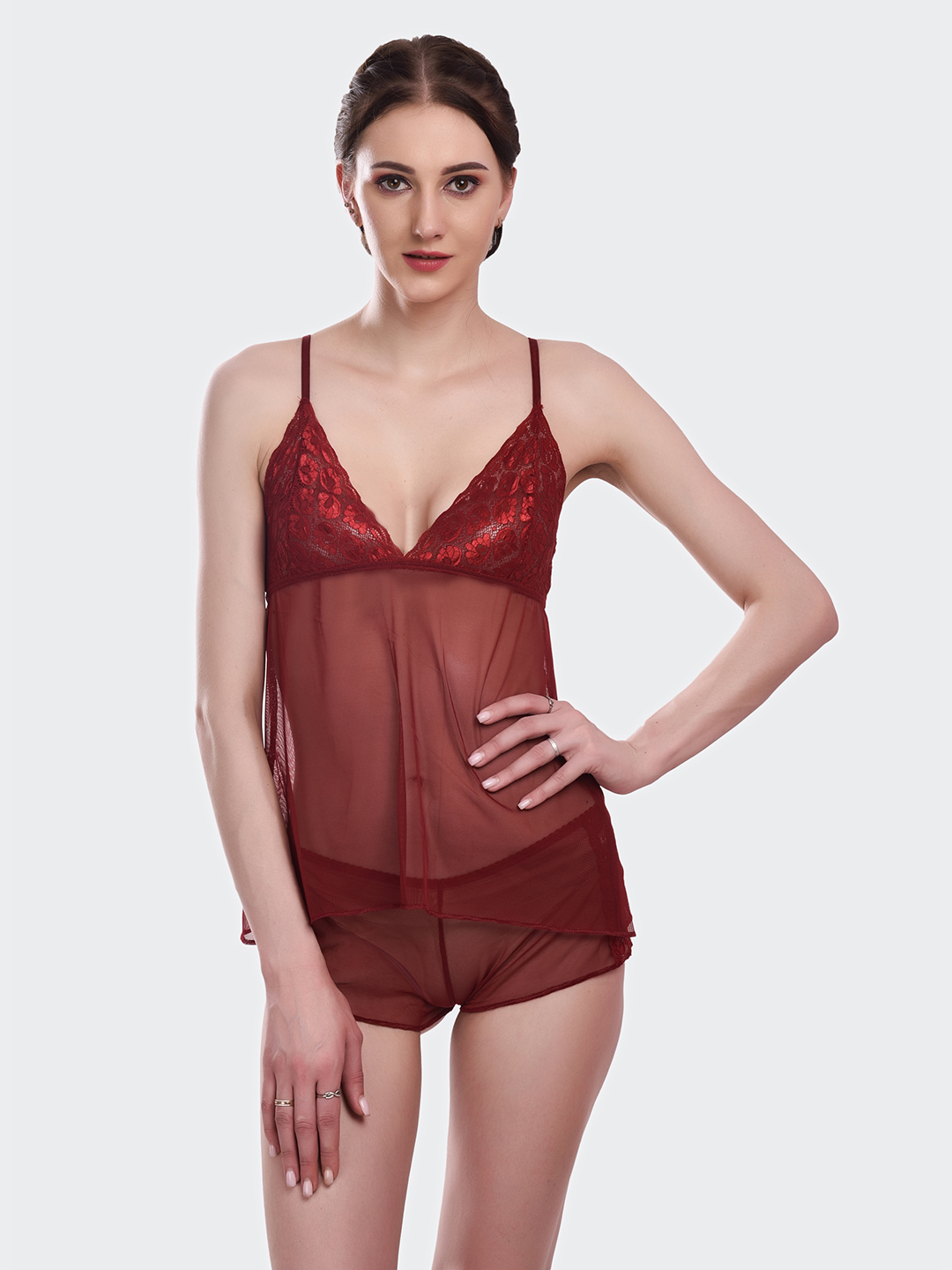 Indulge in luxurious comfort with this KAPCHA wine red lace camisole nightwear set. The elegant ensemble features a sheer mesh lingerie top that exudes feminine charm, paired perfectly with matching shorts for a complete look. The delicate lace detailing adds a touch of sophistication, while the comfortable fit ensures a restful night’s sleep. The wine red colour adds a rich, romantic appeal to this intimate sleepwear set. The camisole’s thoughtful design combines style with comfort, making it an ideal choice for your nightwear collection. The lightweight fabric and carefully crafted details make this set both practical and alluring. Perfect for those who appreciate elegant loungewear, this set offers the right balance of comfort and style. The versatile design makes it suitable for both sleeping and lounging.