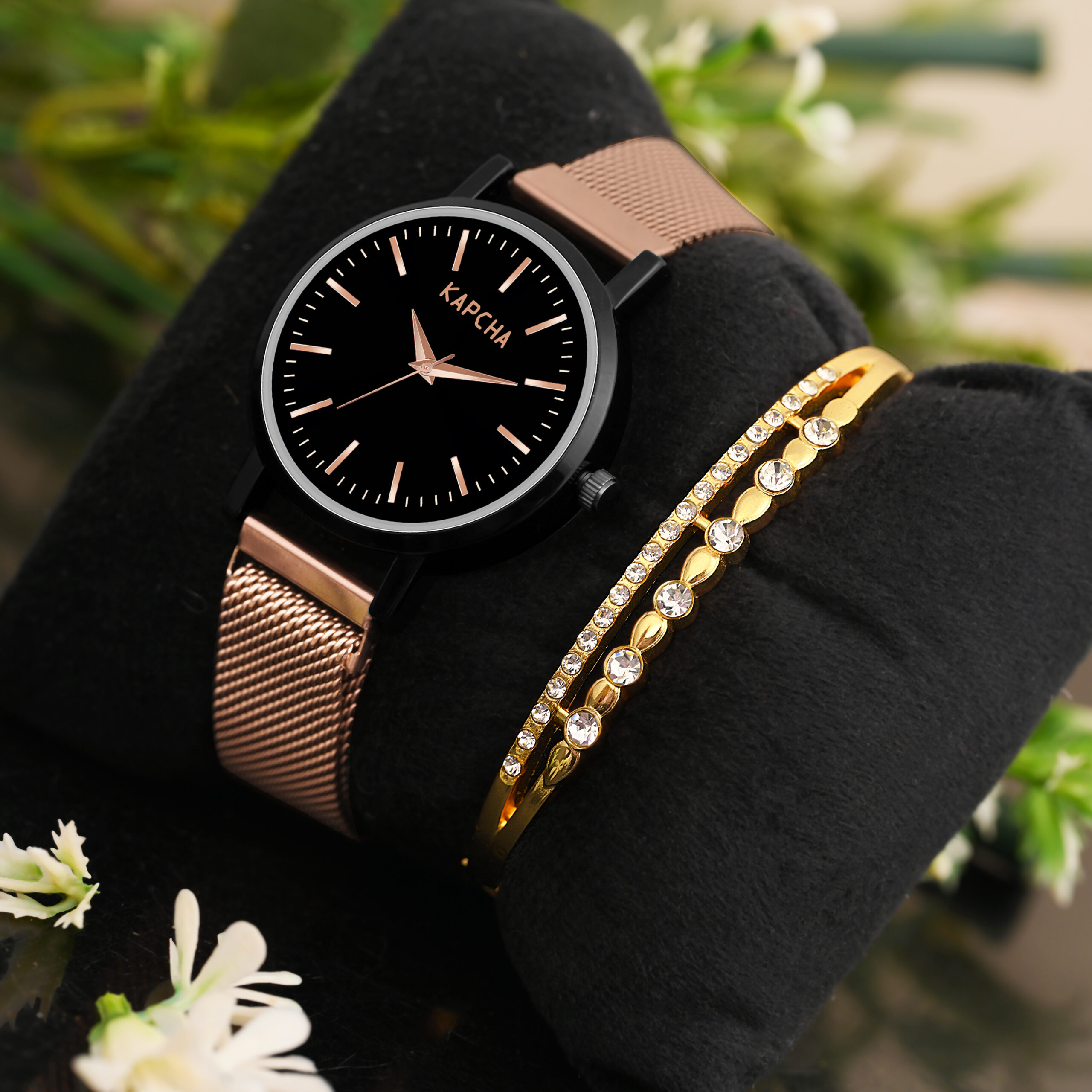 KAPCHA Women’s Mesh Strap Watch with Golden Stone Gifting Bracelet Elegant Design Quartz Movement