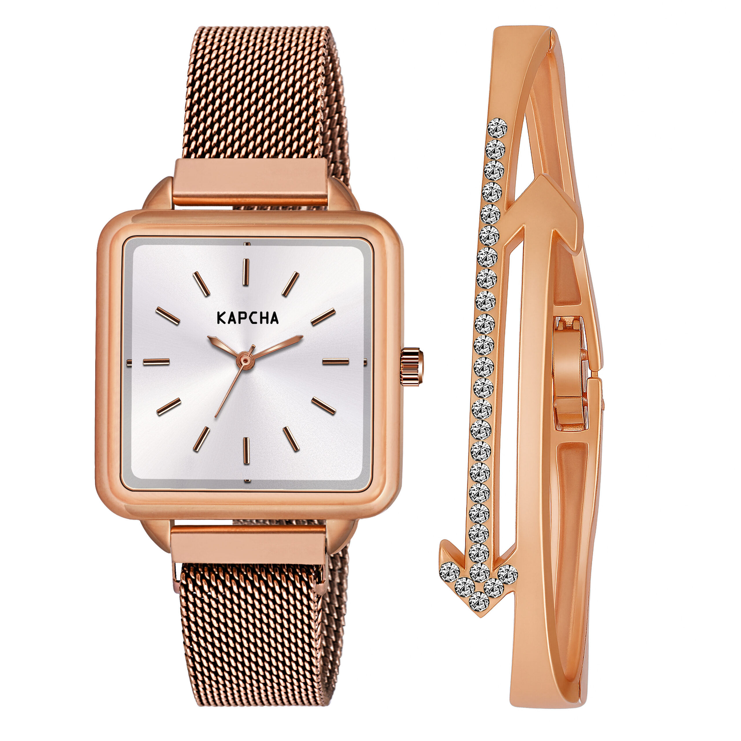 KAPCHA Women’s Rose Gold Square Watch and Bracelet Set – Minimalist Mesh Strap Quartz Watch with Matching Crystal Bangle – Elegant Gift Set
