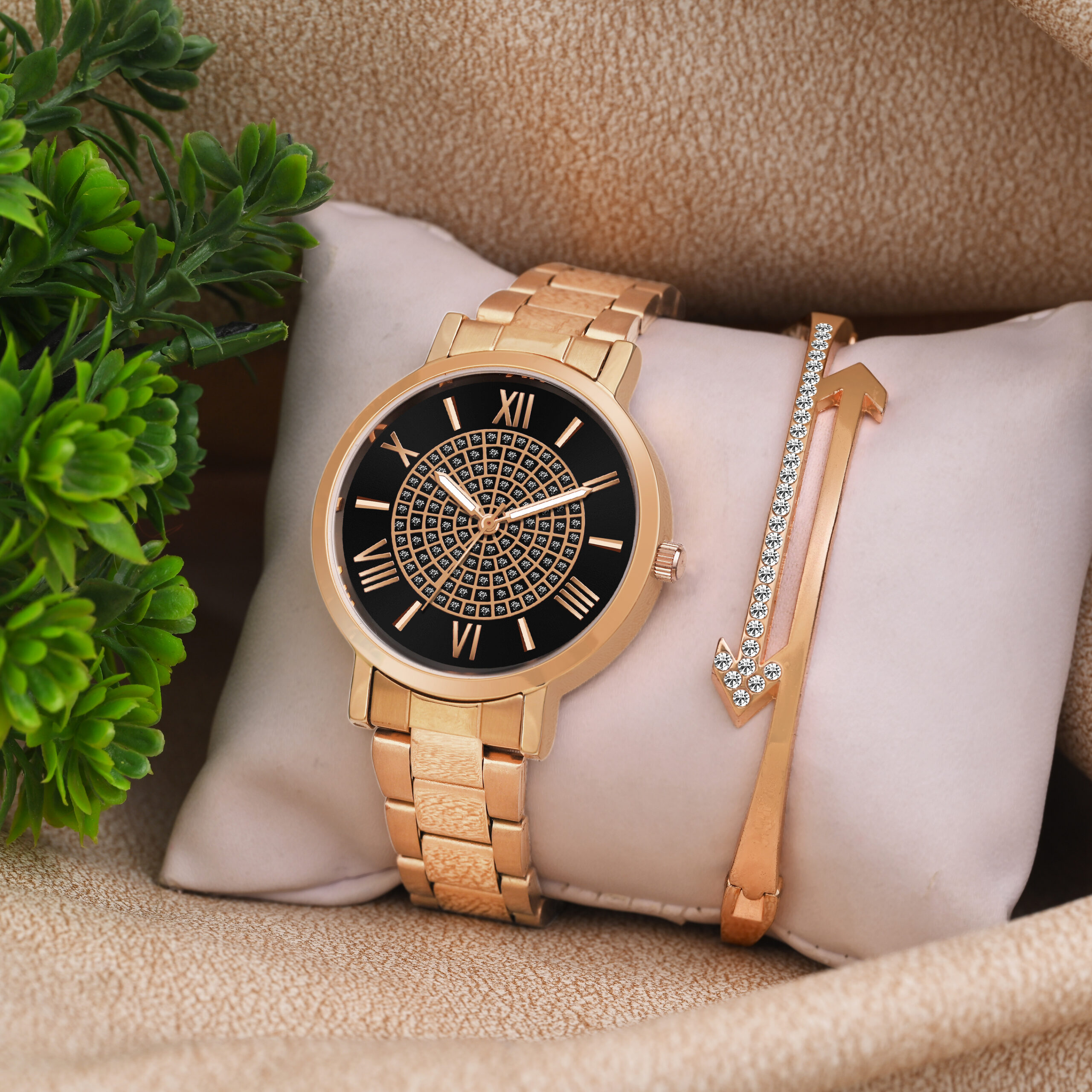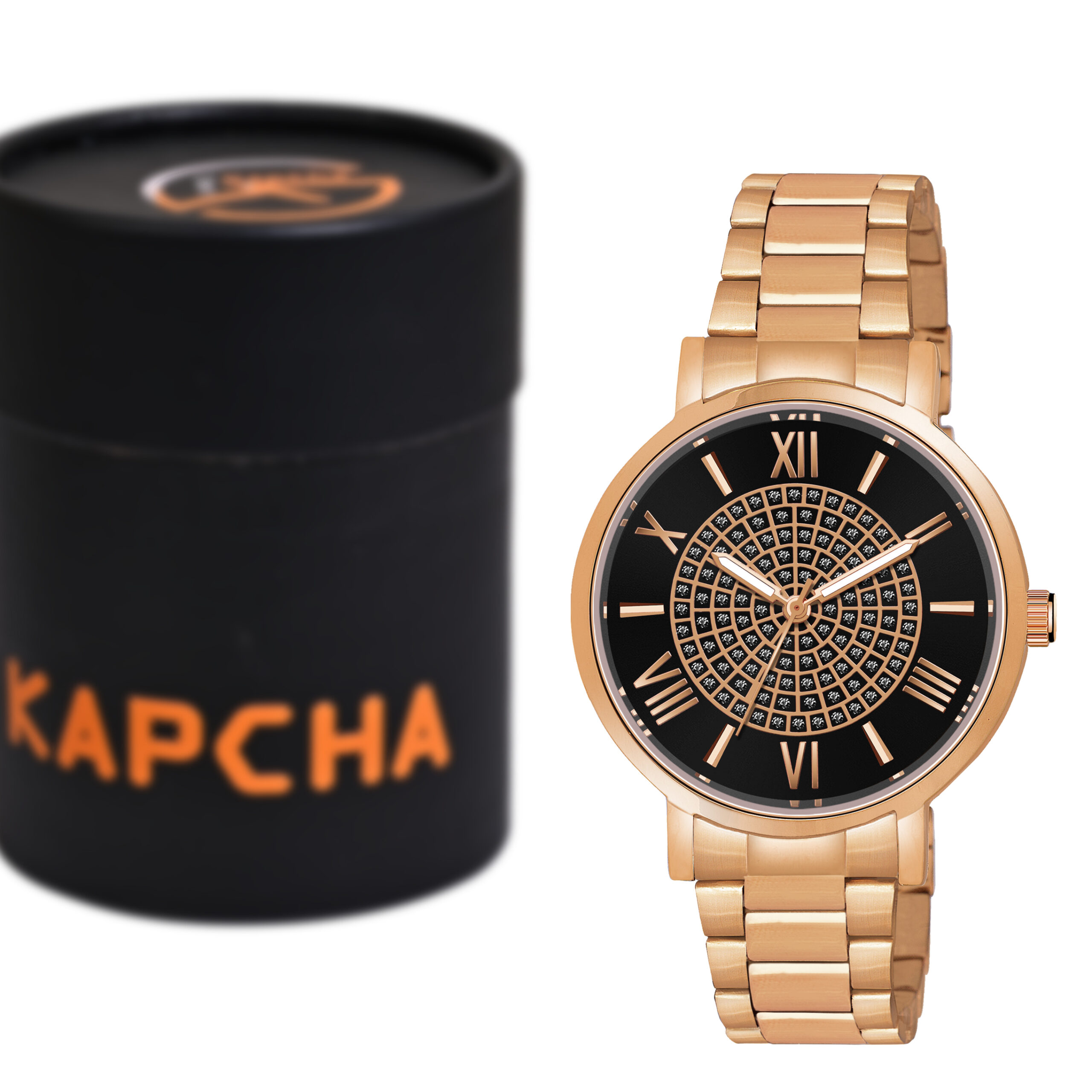 Elevate your style with this exquisite KAPCHA women’s watch and bracelet set. The timepiece features a sophisticated black Roman numeral dial housed in a stunning rose gold case, offering both elegance and functionality. The matching crystal-embellished bangle perfectly complements the watch, creating a harmonious blend of classic and contemporary design. This versatile set transitions seamlessly from day to evening wear, making it an ideal accessory for any occasion. The quartz movement ensures reliable timekeeping, while the coordinated bracelet adds a touch of sparkle to your wrist. Whether worn together or separately, this fashionable set makes for a thoughtful gift or a delightful personal indulgence. The combination of rose gold finish and crystal details creates a luxurious look that enhances any ensemble.