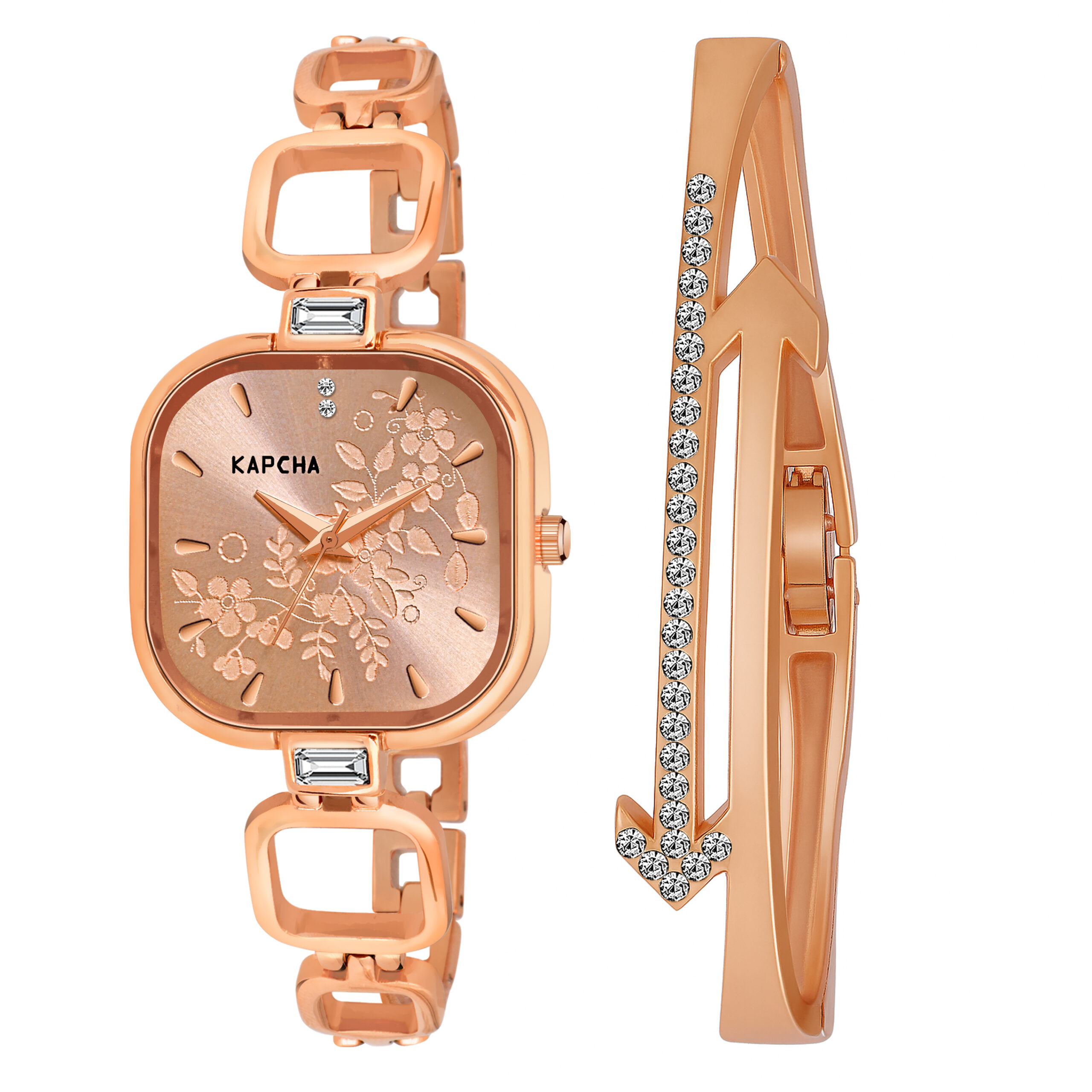 KAPCHA Women’s Rose Gold Watch and Bracelet Set – Floral Dial Quartz Dress Watch with Crystal Bangle – Elegant Luxury Gift Set