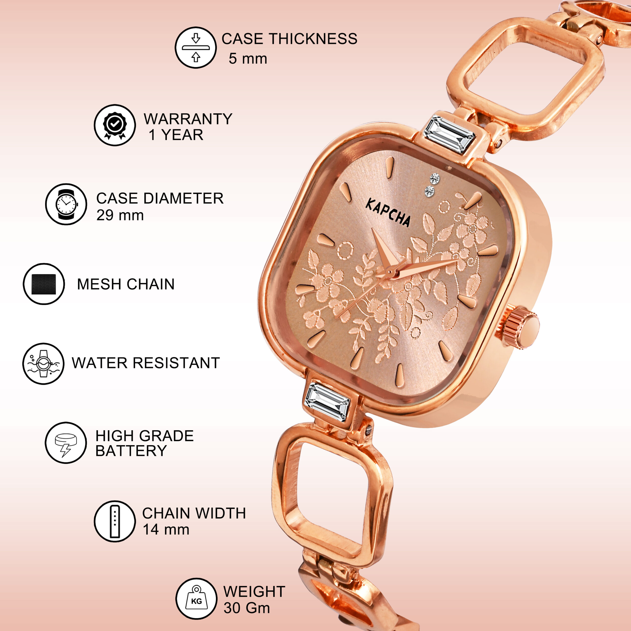 Elevate your style with this exquisite KAPCHA Women’s Watch and Bracelet Set in stunning rose gold. The timepiece features a delicate floral dial that adds a feminine touch to your ensemble, whilst the crystal-embellished bangle bracelet perfectly complements the watch’s elegant design. The quartz movement ensures reliable timekeeping, making this set both beautiful and functional. The harmonious pairing of the watch and bracelet creates a coordinated look that’s perfect for both everyday wear and special occasions. This sophisticated set makes for a thoughtful gift choice, presented in a manner that’s sure to impress. The rose gold finish adds a warm, luxurious element that enhances any outfit, from casual to formal wear. Whether worn together or separately, these pieces offer versatile styling options for the modern woman who appreciates refined accessories.