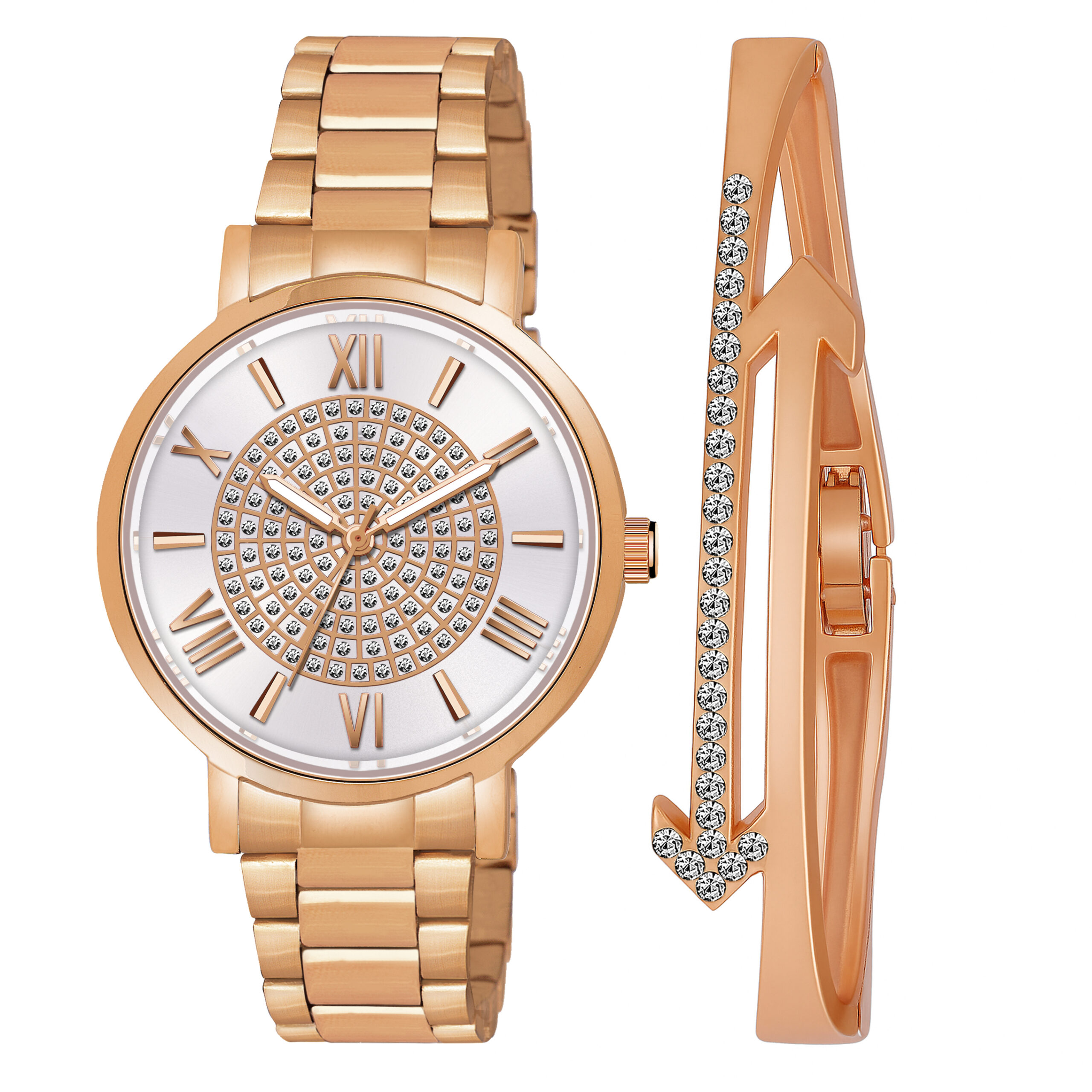 KAPCHA Women’s Rose Gold Watch and Bracelet Set – White Roman Numeral Dial Quartz Watch with Crystal Bangle – Gift Set