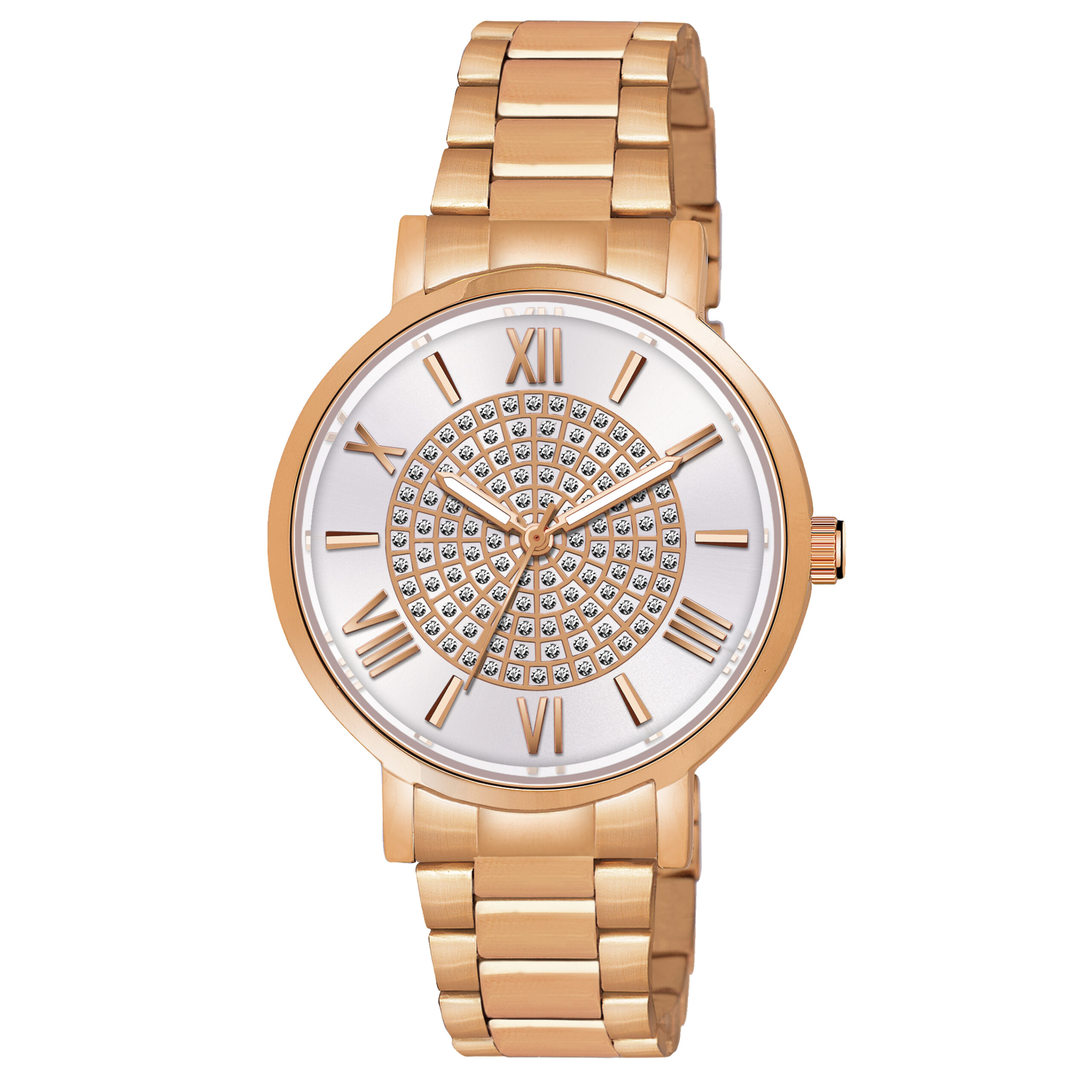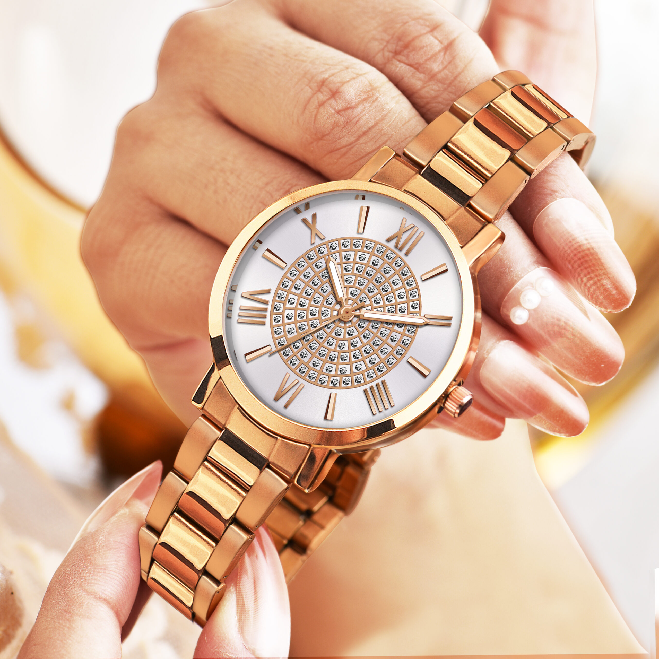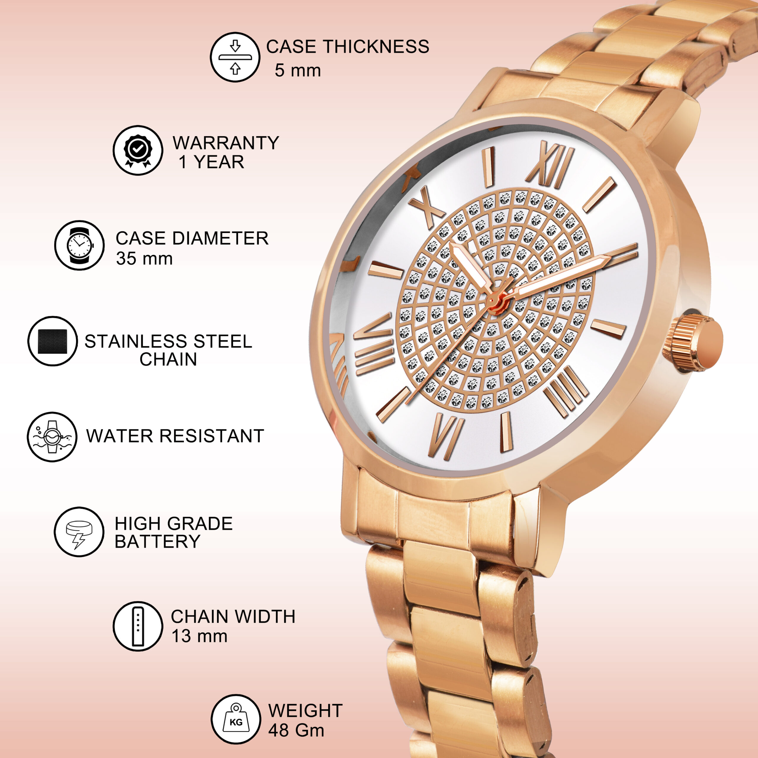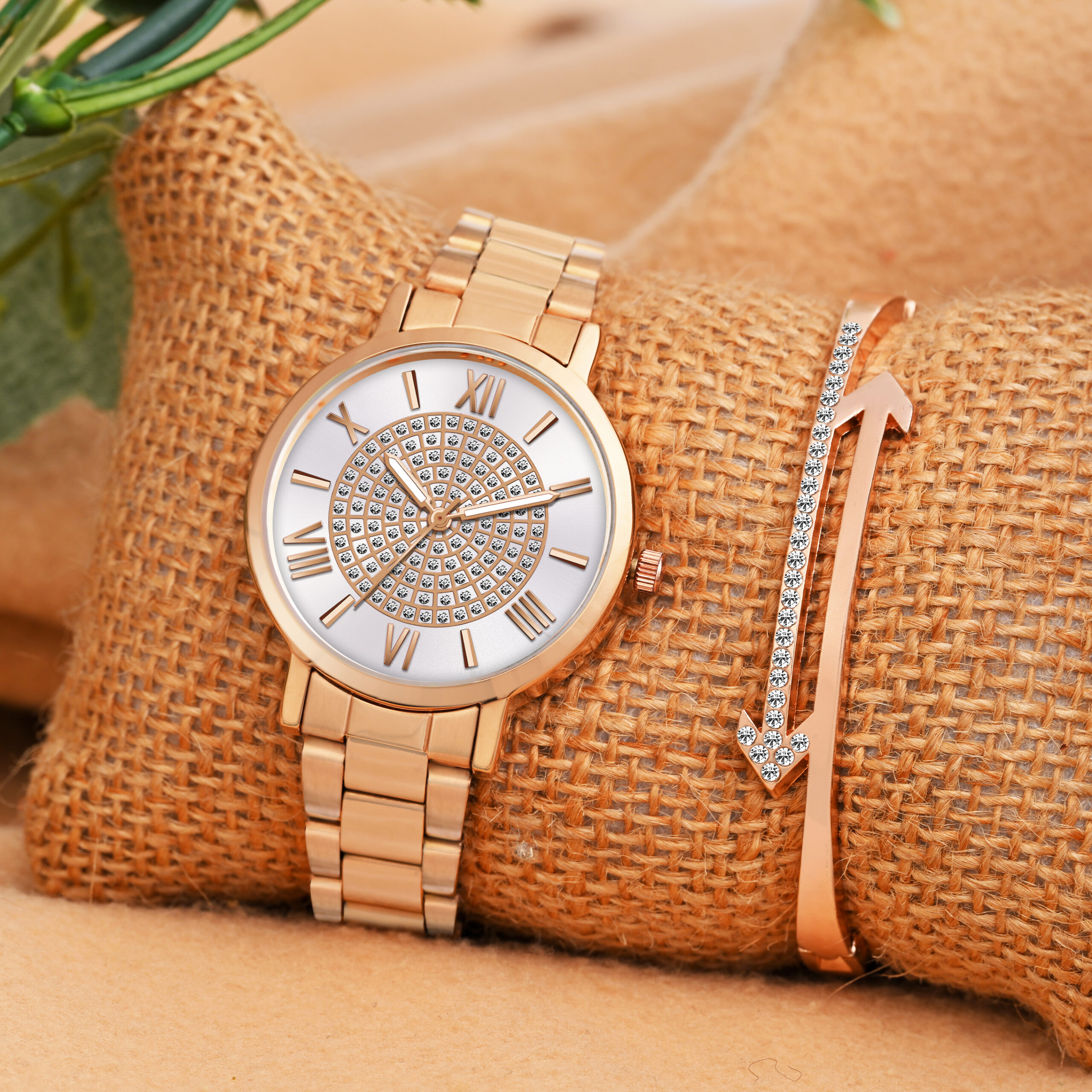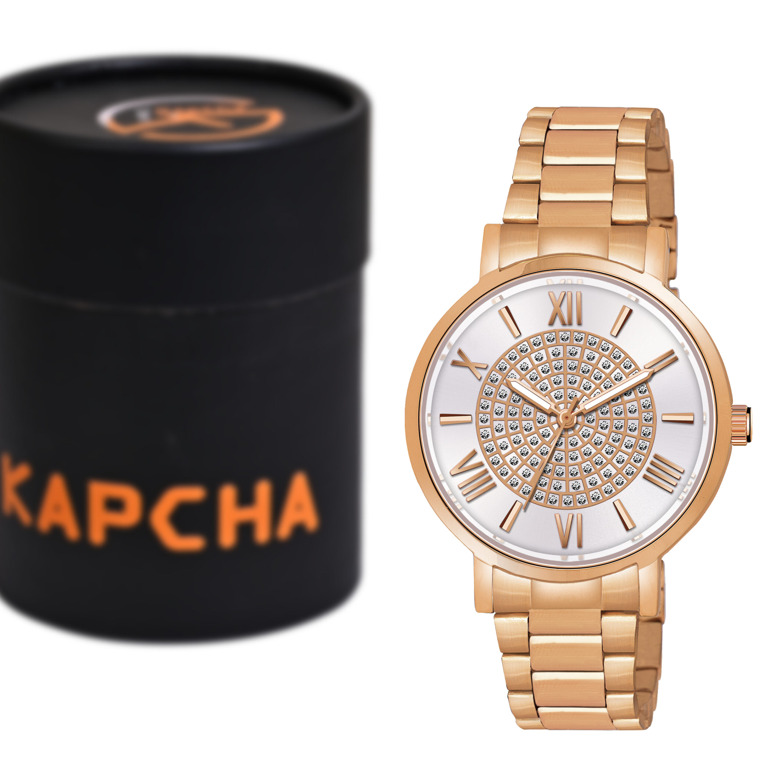 Elevate your style with this exquisite KAPCHA watch and bracelet set in stunning rose gold. The timepiece features a sophisticated white dial adorned with elegant Roman numerals, offering both classic appeal and easy time-reading. The matching crystal-embellished bangle adds a touch of sparkle and glamour to this fashionable ensemble. Perfect for both everyday wear and special occasions, this quartz-powered watch combines reliability with aesthetic charm. The set makes for a thoughtful and stylish gift choice, ideal for birthdays, anniversaries, or as a treat for yourself. The harmonious pairing of the watch and crystal bangle creates a coordinated look that effortlessly enhances any outfit, from casual to formal wear. This versatile accessory set exemplifies modern sophistication while maintaining timeless appeal.