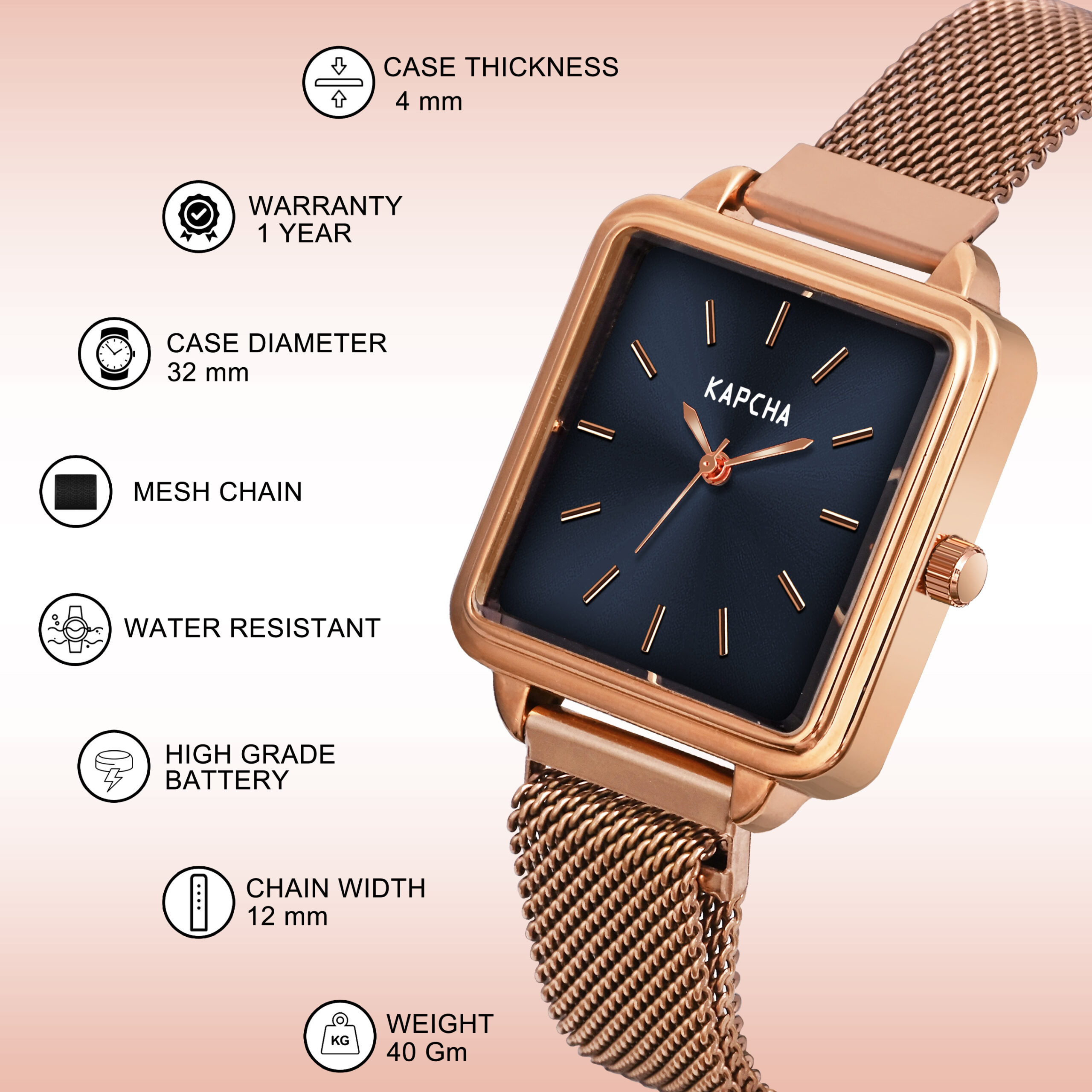 KAPCHA Women’s Square Rose Gold Mesh Strap Watch – Minimalist Black Dial Dress Watch – Elegant Stainless Steel Quartz Timepiece