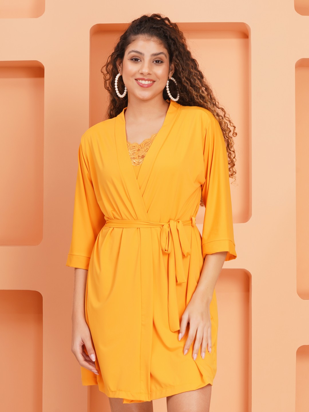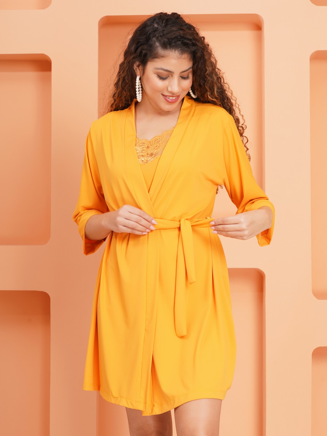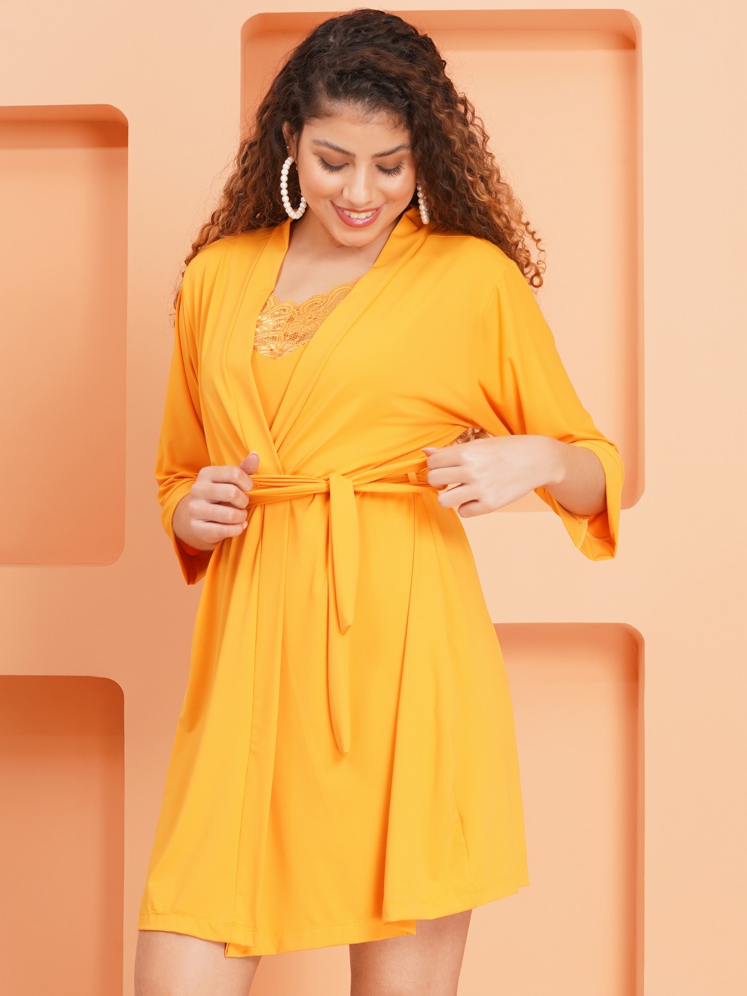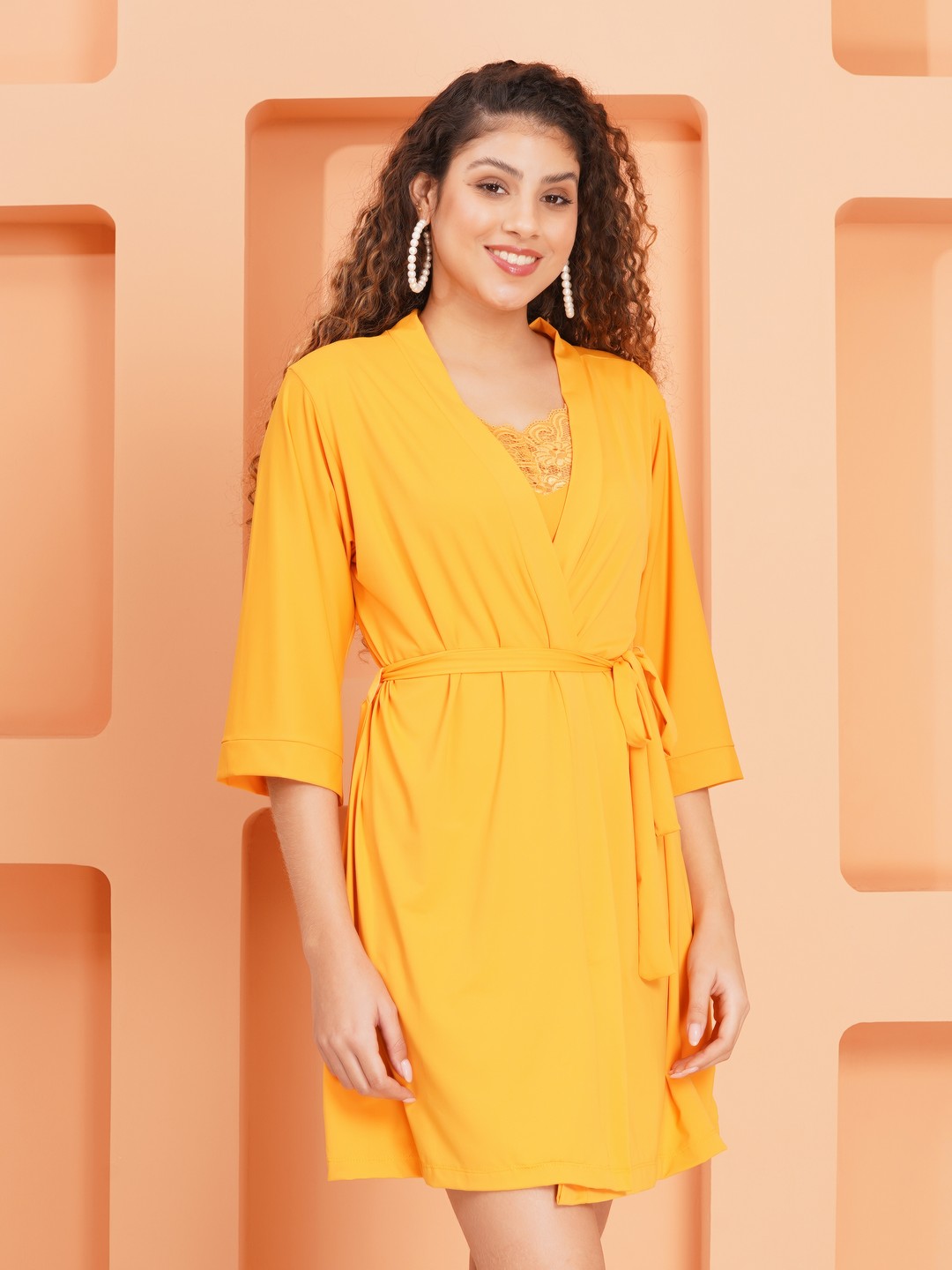 KAPCHA Women’s Yellow Satin Nightdress with Robe – 2-Piece Satin Nightwear Set with Lace Detail – Bridal & Honeymoon Lingerie
